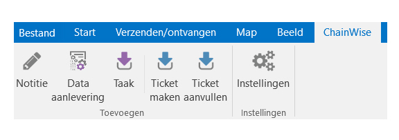 Deze maand lichten we de Outlook plugin toe. De module biedt de mogelijkheid om extra functionaliteit in Outlook te installeren, waarmee een e-mail in Outlook (compleet met bijlagen) in ChainWise opgeslagen kan worden. Dit kan als notitie, data aanlevering, taak of (als u de helpdeskmodule gebruikt) een nieuw ticket of aanvulling van een ticket zijn. Voorwaarde is wel dat u de rechten heeft om dit aan te maken in ChainWise.