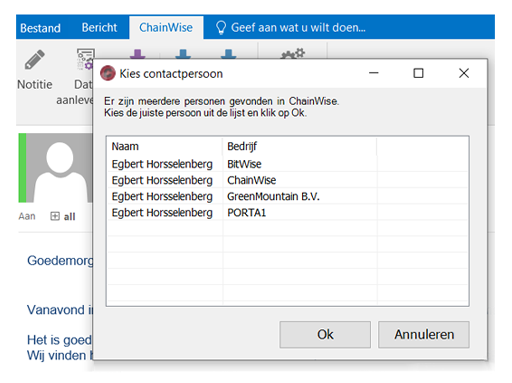 Het nieuw aan te maken item wordt in ChainWise gekoppeld aan de persoon die de informatie heeft gestuurd. Dit gebeurt op basis van het e-mailadres van waar de informatie is ontvangen. Als dit e-mailadres niet bekend is in ChainWise, dan is het mogelijk om de persoon als nieuw persoon in ChainWise op te slaan óf om het aan te maken item te koppelen aan een al wél aanwezig persoon in ChainWise. Mocht een contactpersoon vaker dan eens voorkomen in ChainWise dan kan de juiste gekozen worden.