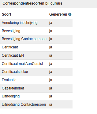 - Als gebruik wordt gemaakt van ‘correspondentiesoorten bij cursus’ check dan bij de cursus of Genereren van certificaat op ‘ja’ staat.